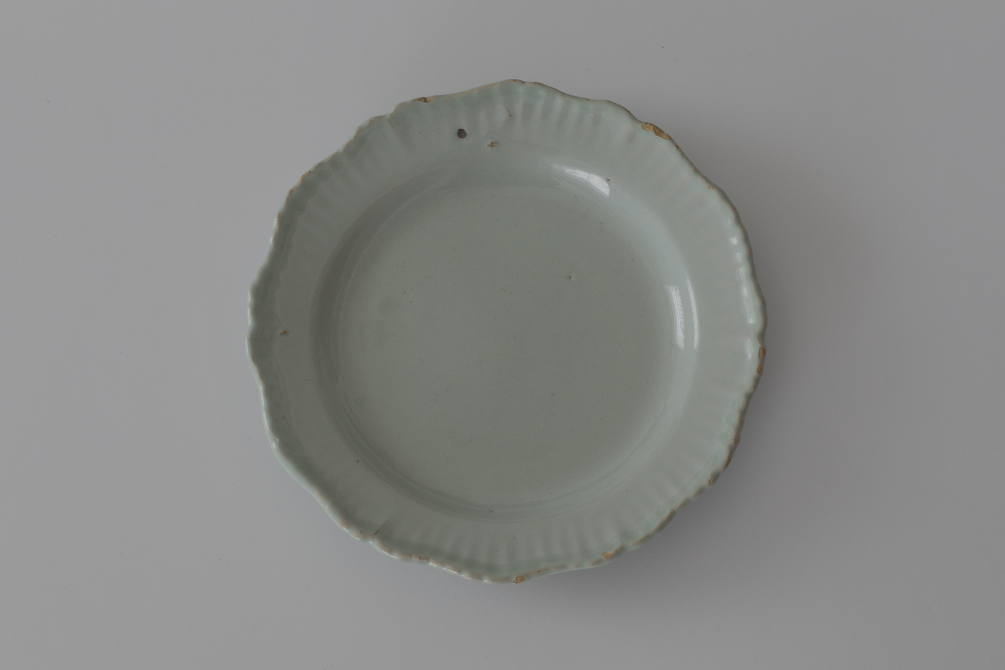 釉はほのかに青磁を思わせる青みを帯び、どこか東洋磁器にも通じるような滋味を感じます。18世紀半ば頃、フランス。ファイアンス焼のリム皿。