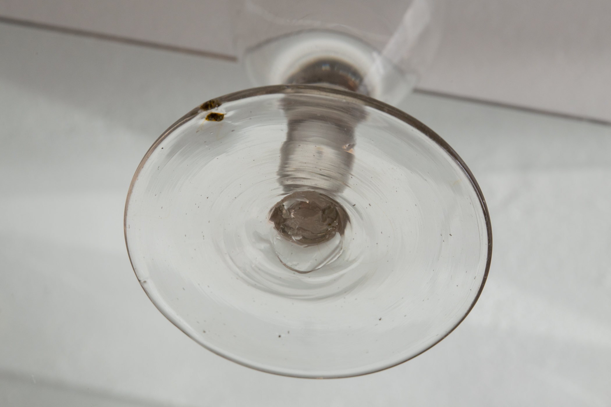 ガラスの質とやや円錐型のフット形状から、19世紀中期以前の古い品だろうことが推測できますが、給仕の存在が前提にあり、常に注ぎ足しながら用いられた富裕層のための18世紀、繊細で小さなブルギニョングラスの類に比べると、ぐっと堅牢な造りで、また今の日本の暮らしにもワイングラスとして自然と馴染む中庸な寸法(約13センチ)です。