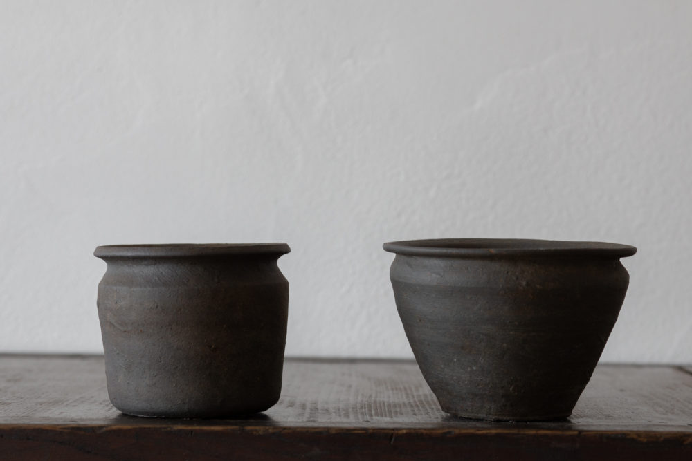 紹介はコンフィチュール用ポット。白い半陶半磁器やガラス器の作りが一般に知られますが、ゲールの陶器としては少し珍しい作りです。空間を引き締めるやわらかな黒は、ポプリポットやキャンドルポットにしたら、きっと素敵ですね。