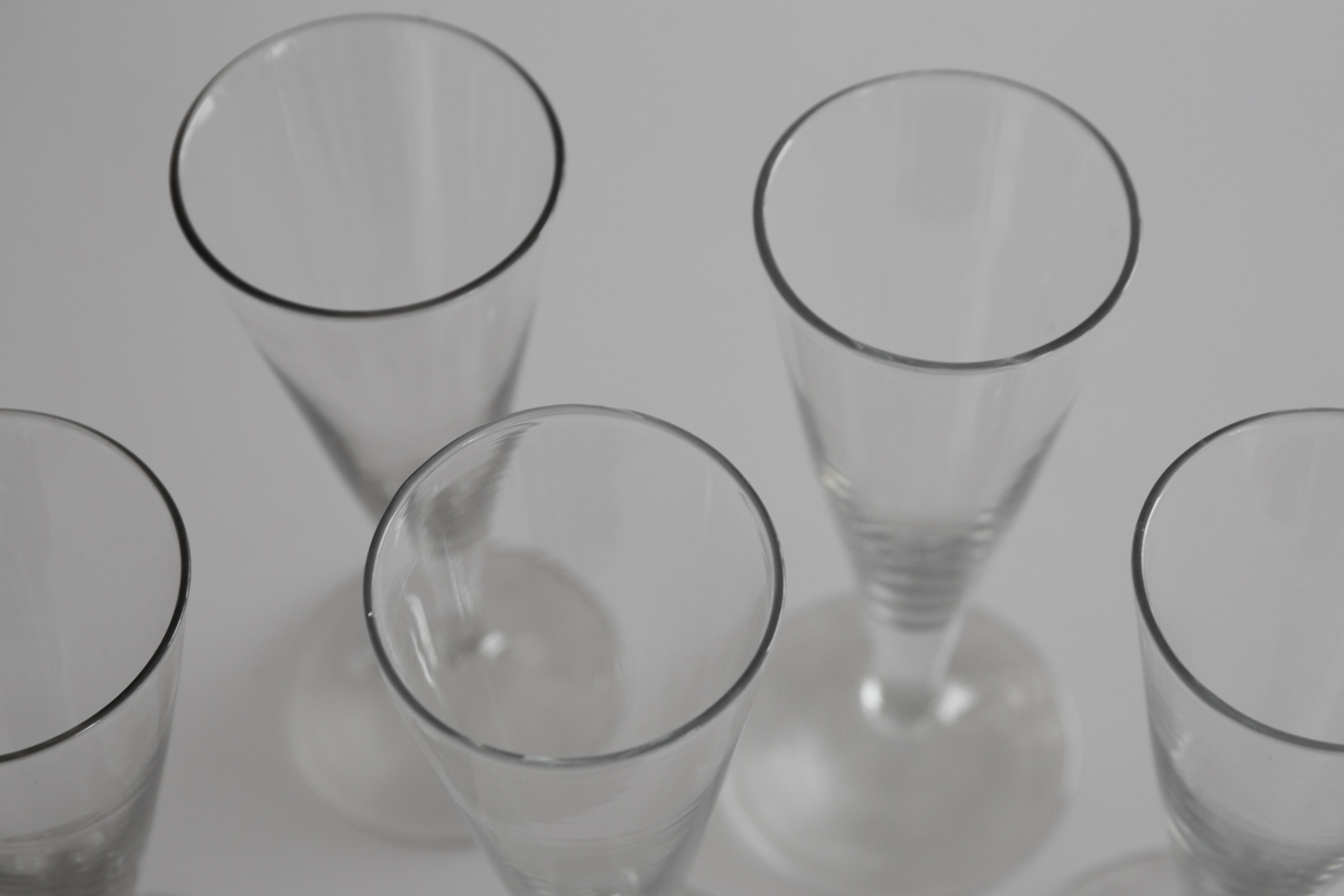 素っ気ないほどまっすぐな筒形に、古いガラス特有のわずかなゆらぎと気泡。厚みのある底の安定感としっとりとした指馴染み。19世紀末、フランス。吹きガラスのゴブレ。