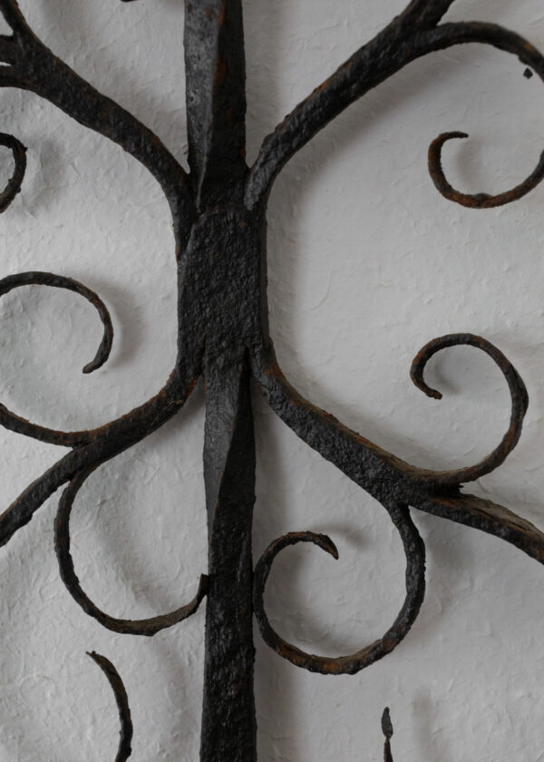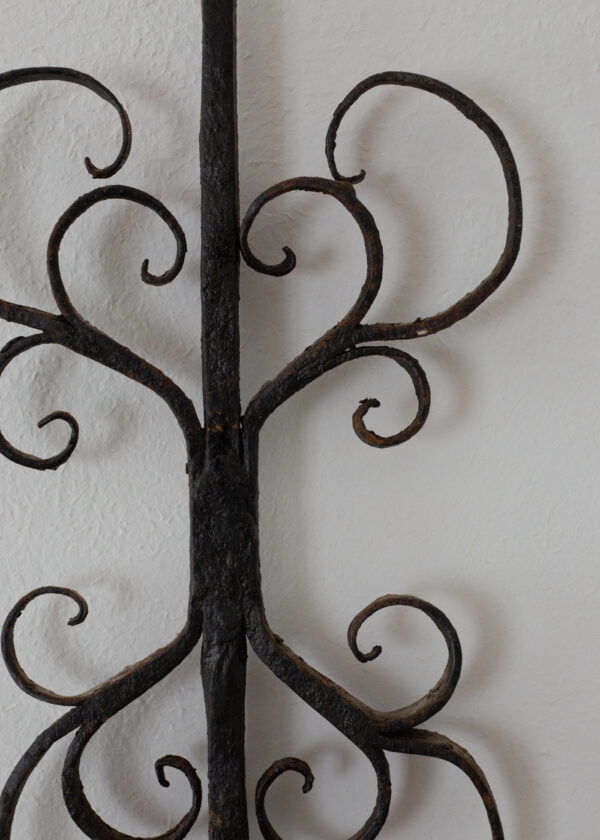 唐草文のような小気味良い螺旋装飾。暖炉脇に飾ることを踏まえた遊び心すら感じる意匠性に、ざらりとした柔らかな18世紀なりの鉄味も雰囲気があります。