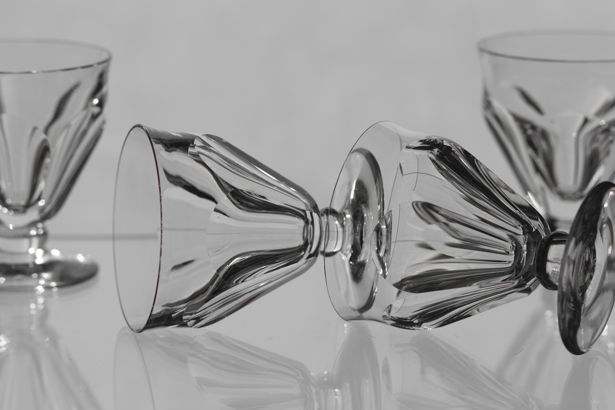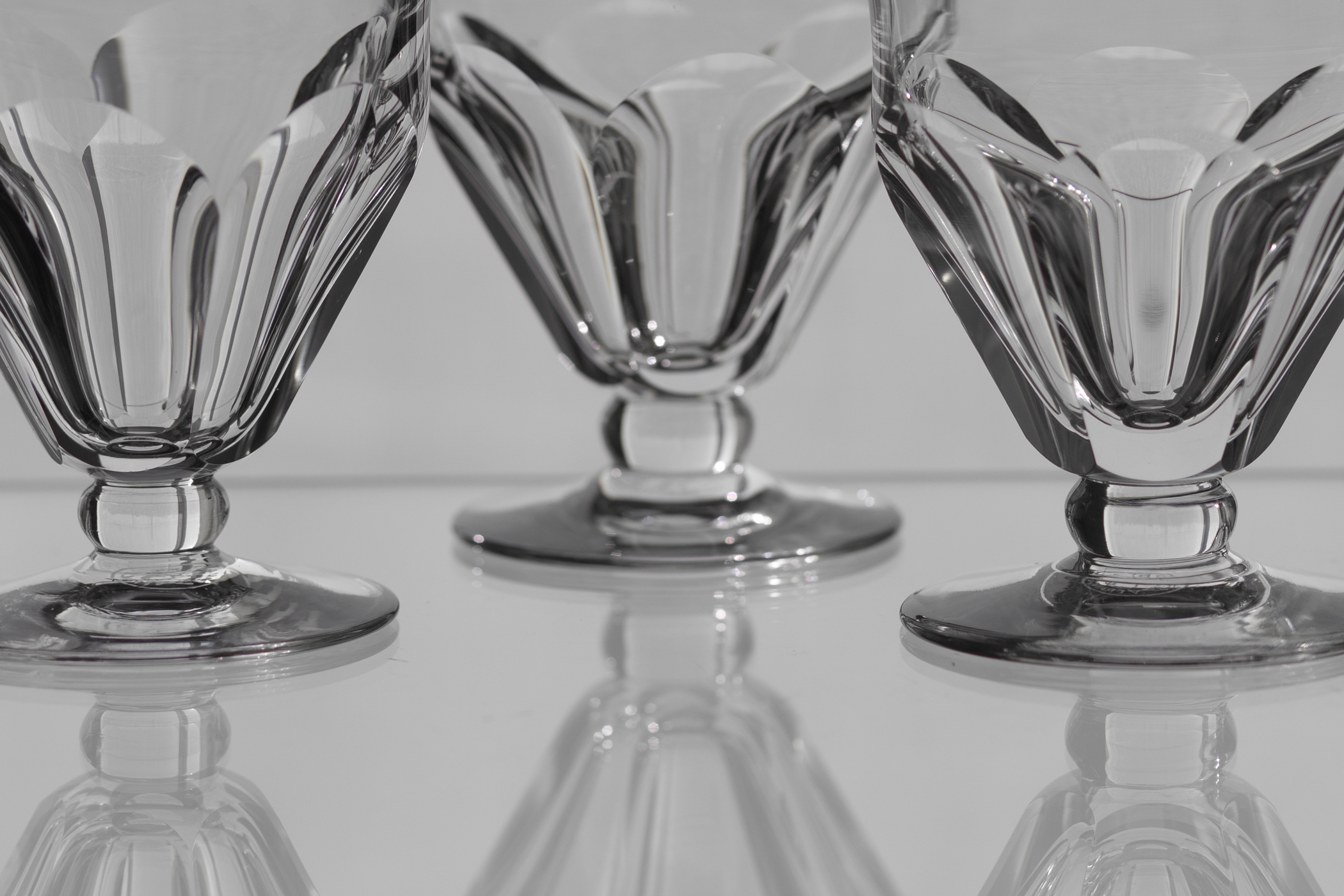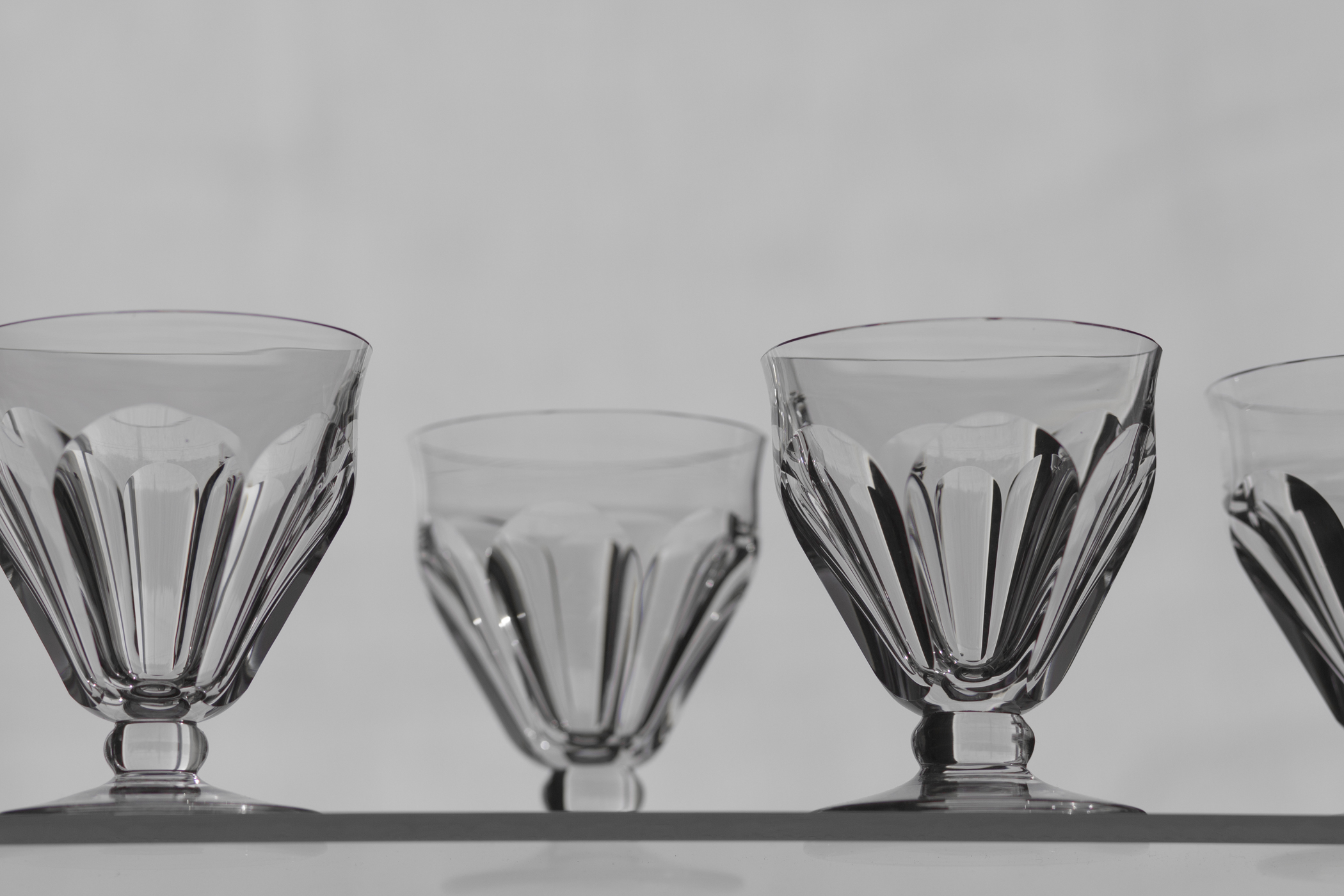 コンサバティブでありがらも非俗には陥らず、繊細で端正なエレガンス。196070年代初期頃、サンルイ。クリスタルのワイングラス。