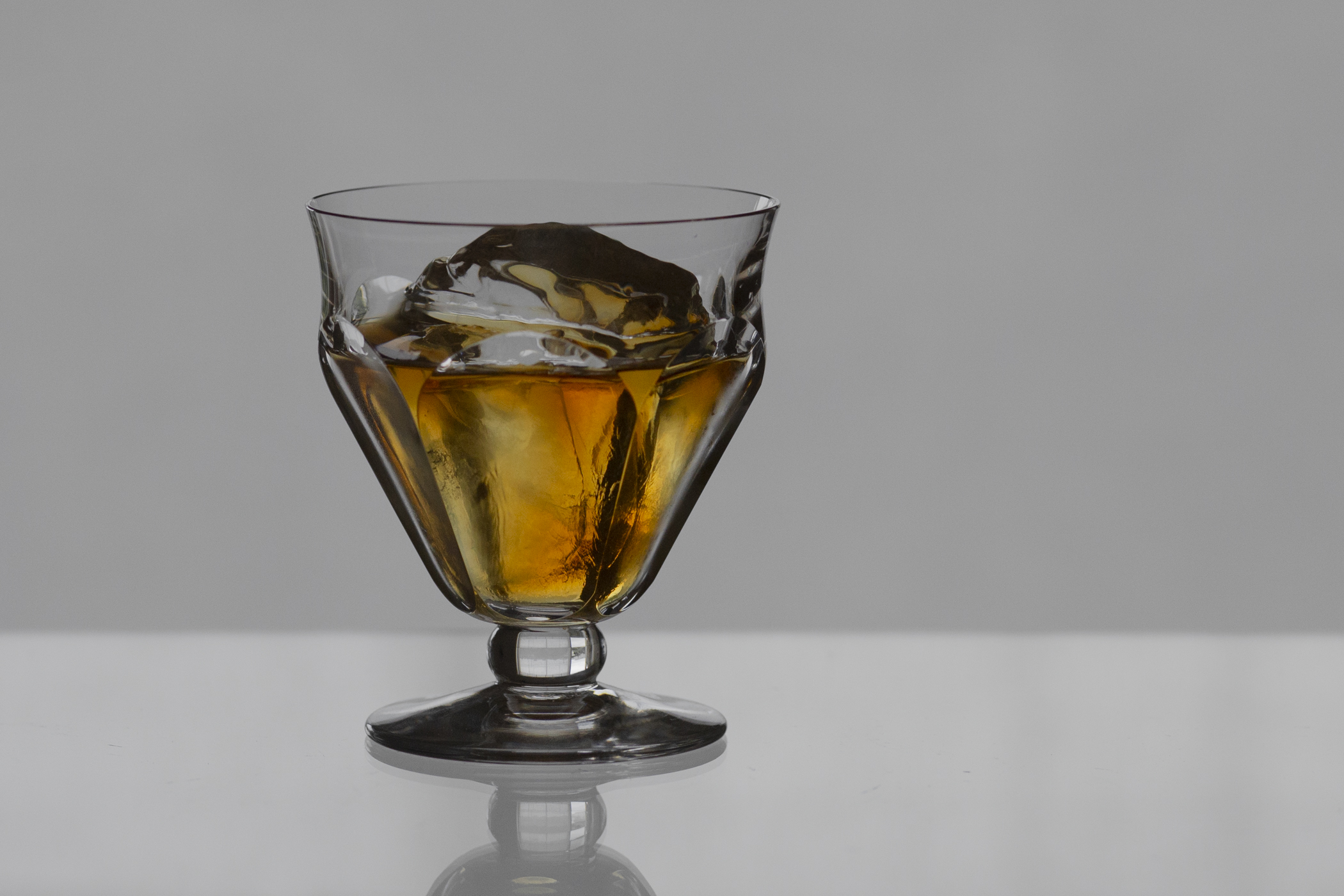 宙吹き成形のゆらぎや躯体の歪みに、手になじむしっとりとした重たさ。フランスの伝統に倣った七片のフラットリブが指に自然に掛かり、光を静かに返します。19世紀フランス、トロンプ・ルイユのガラス酒器。