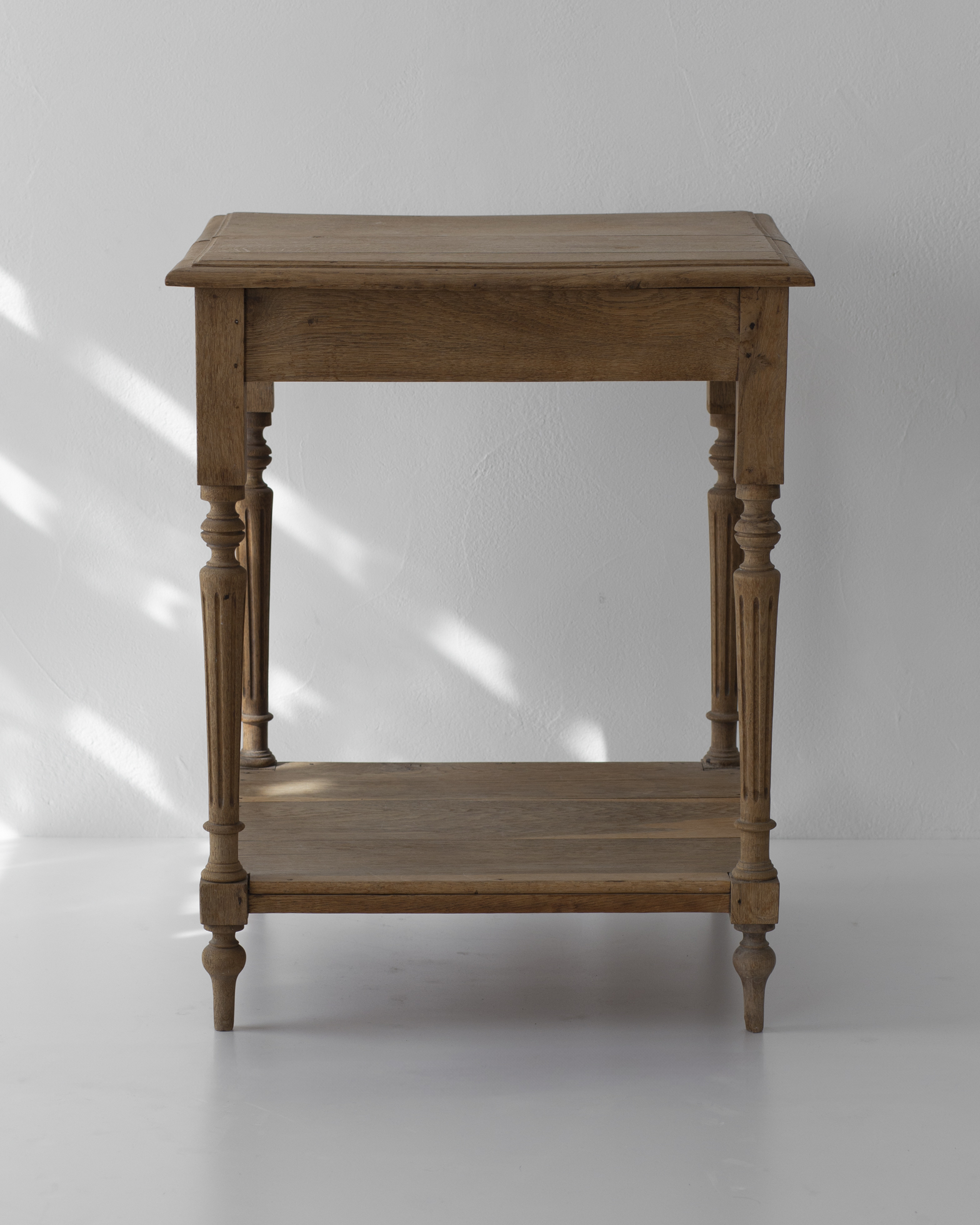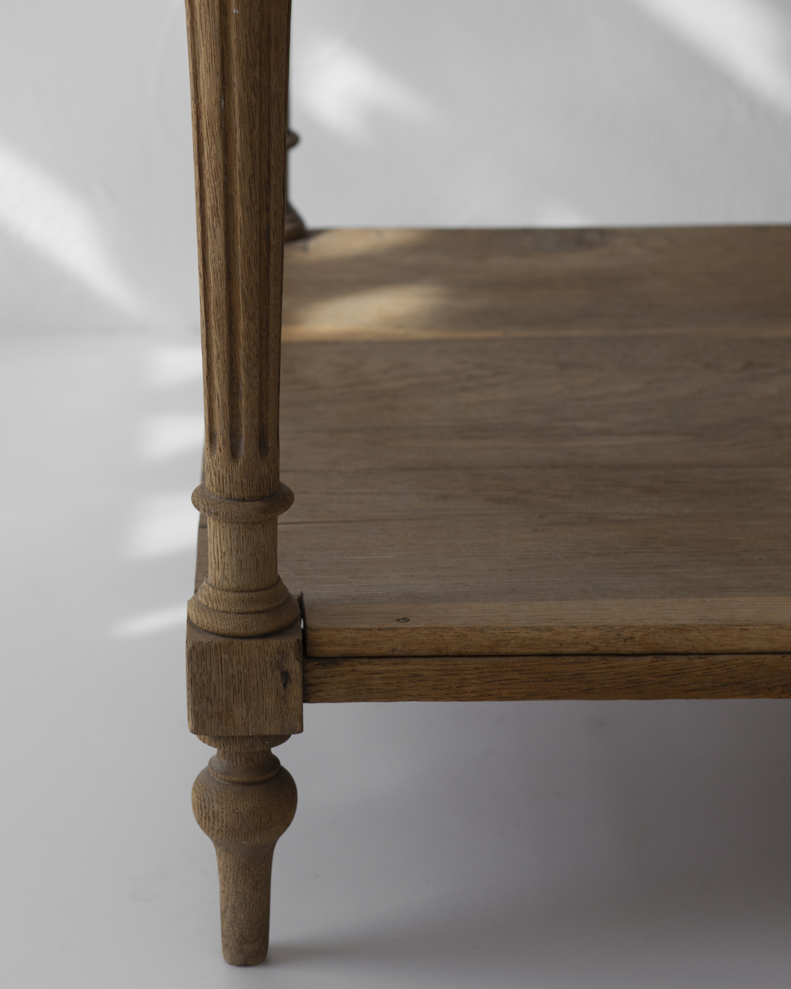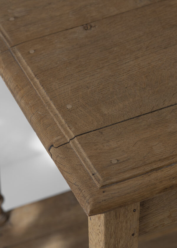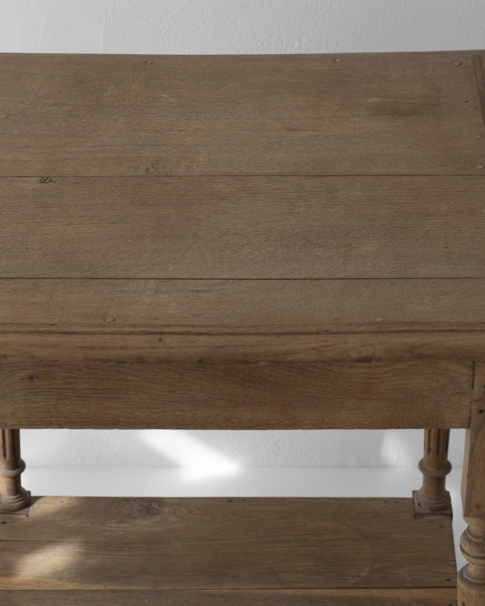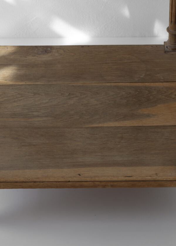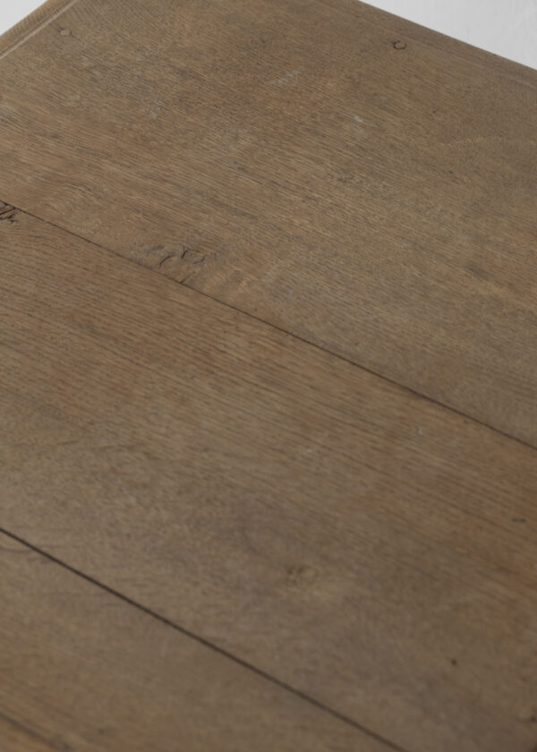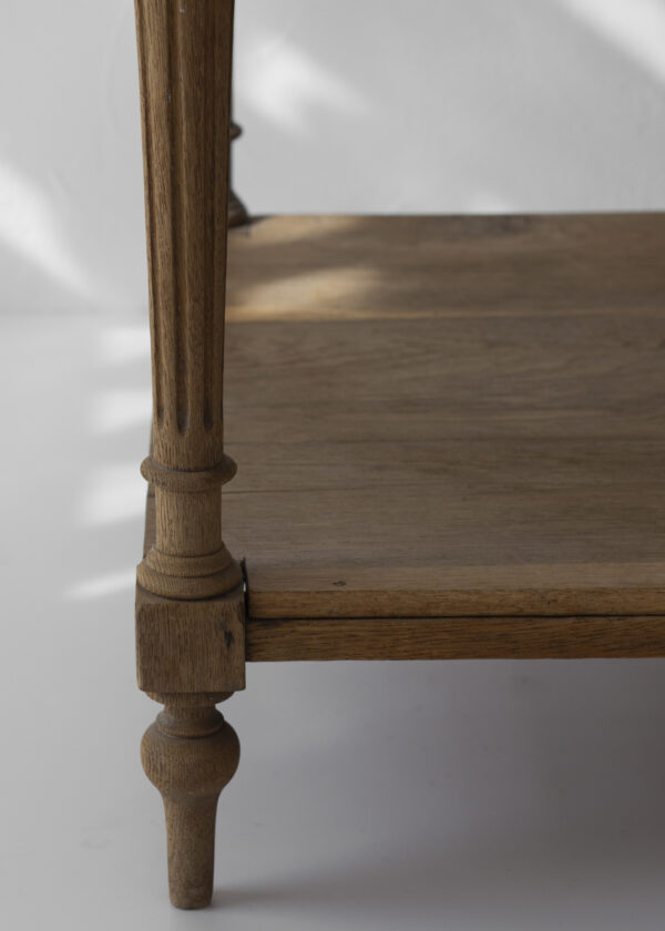 全体は線の細い設計で、西洋らしい装飾性も繊細で嫌味がありません。堅木のオーク材。品のある木目と心地よい重たさが家具としての質の高さを伝えてくれます。さらりとした軽やかさと、物としての密度、重心の低さが混じり合ったよい家具でした。