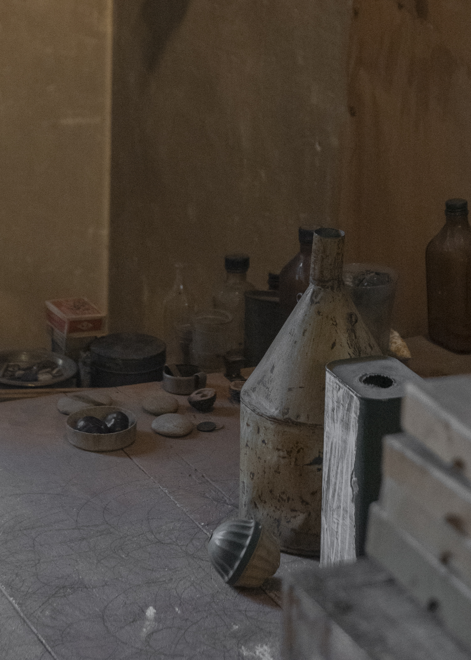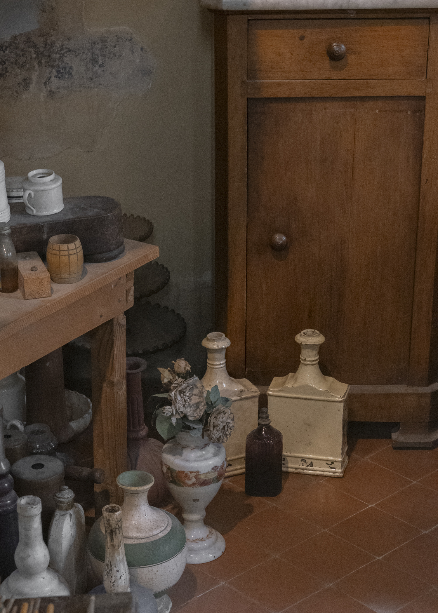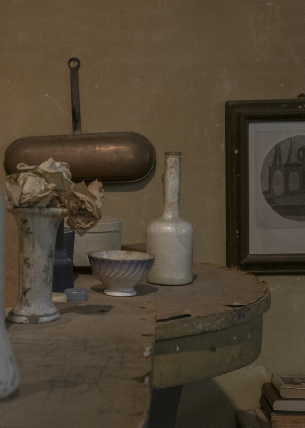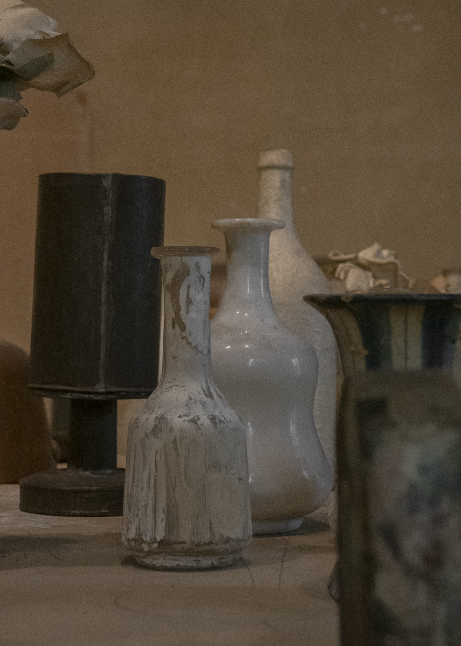 画家の気配が残る室内では、些細でたわいもないはずの壺や壜が、手元に集ってきたことは自然で必然であったかのようにして親密にならび、そうして互いにたのしそうに語りあっていました。