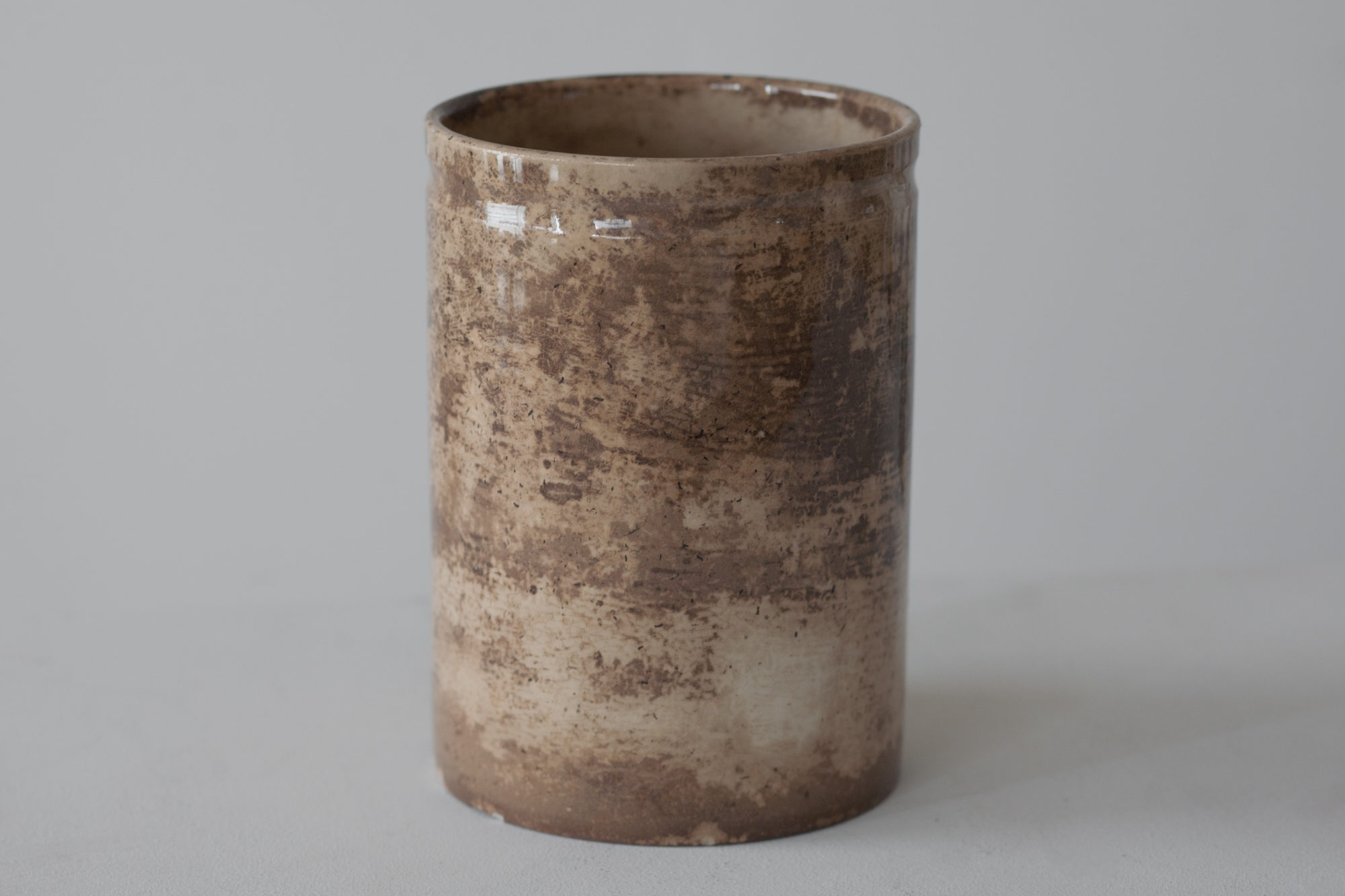 かつての持ち主に長く使い込まれたことにより生まれた固有の風合い。刻まれた時間の深み、アブストラクトな陶景色。1900年代初頭北フランス、サンタマン=レゾー。オブジェとしての風格すら感じる美しい保存器です。