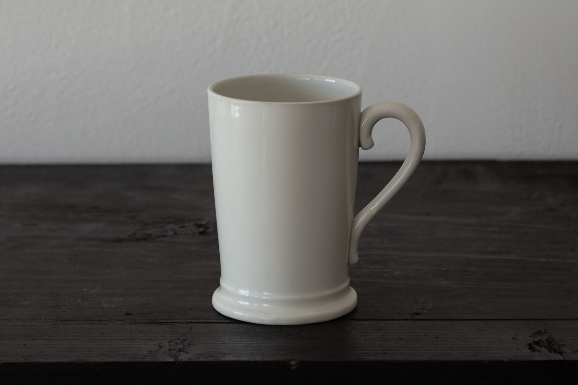ペイトリュス・ルグー社のタンカード。英国のピューターや純銀製、ドイツの炻器製と、さまざまな素材の造りが知られますが、こちらはオランダより、ダッチ・ストーンウェアとも呼ばれる半陶半磁製の白釉器です。