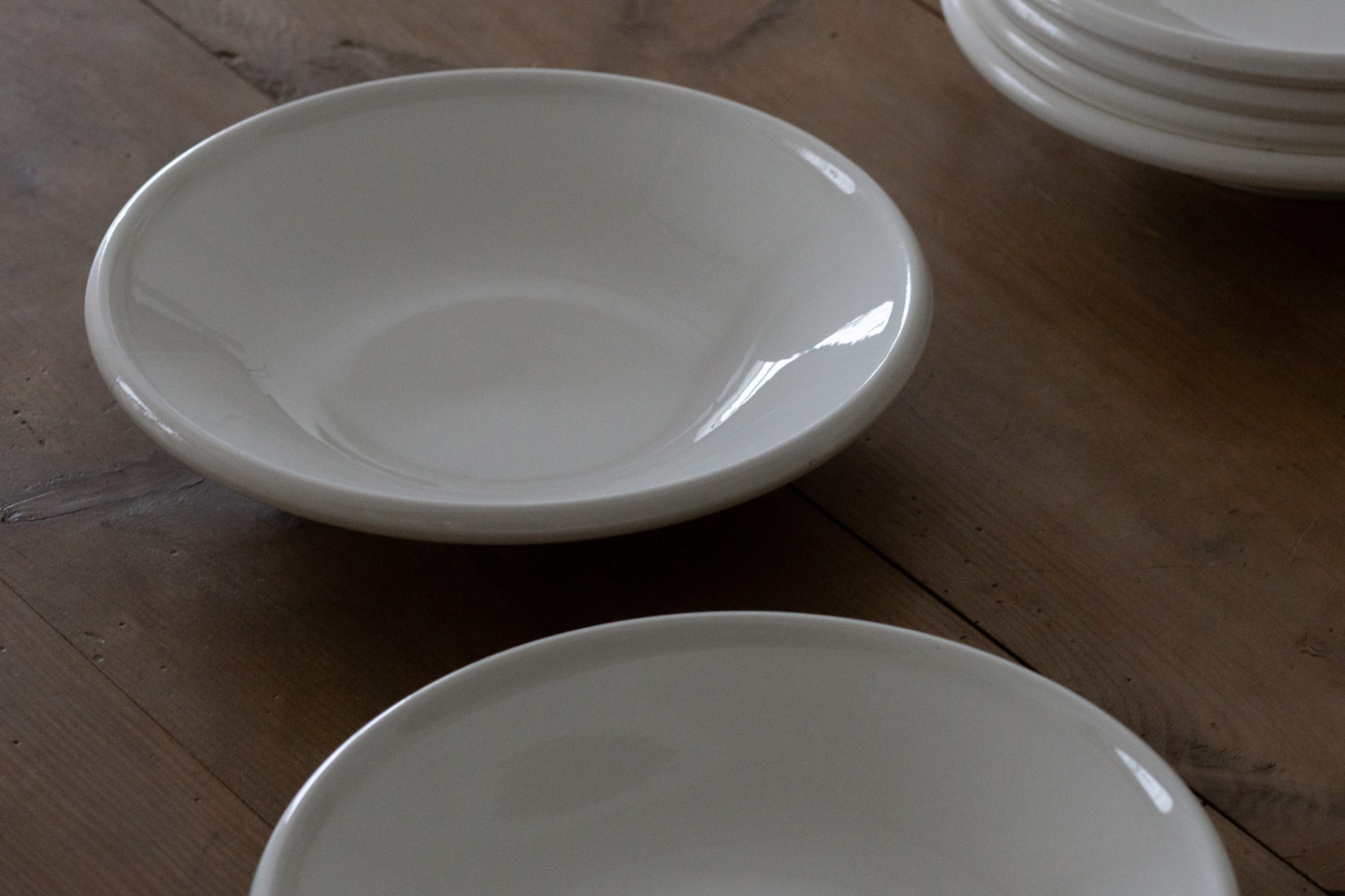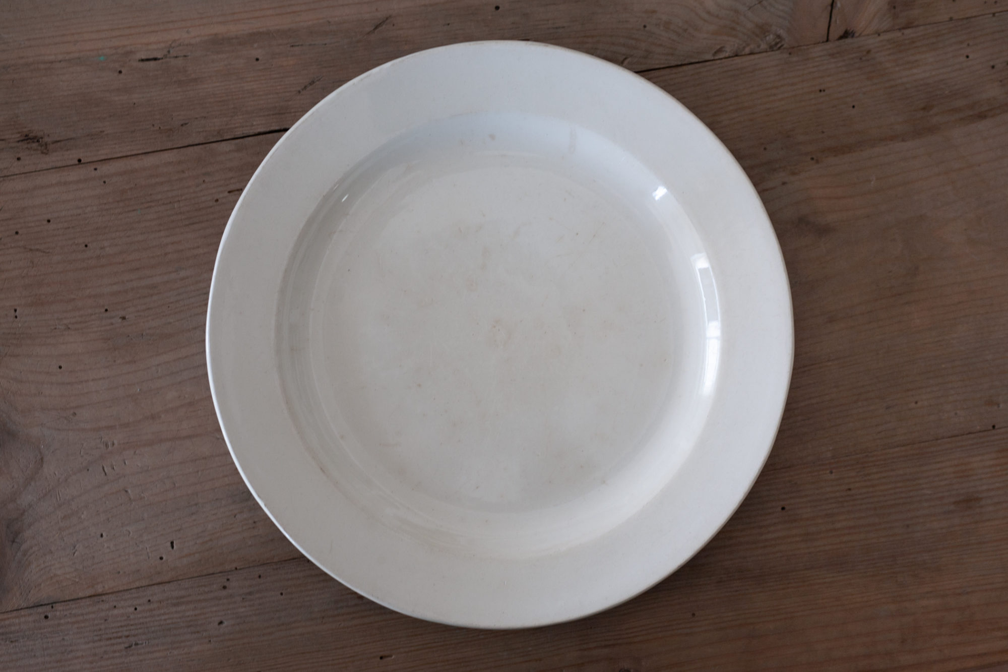 モダンデザインの萌芽が見えるモデリングに、古いフランスのクラシックを感じる良質な半陶半磁というマテリアル。使い込まれた白釉の古色もいい雰囲気です。シャルキュトリーにフロマージュ。そんな盛り付けが映えそうな白釉の大皿。