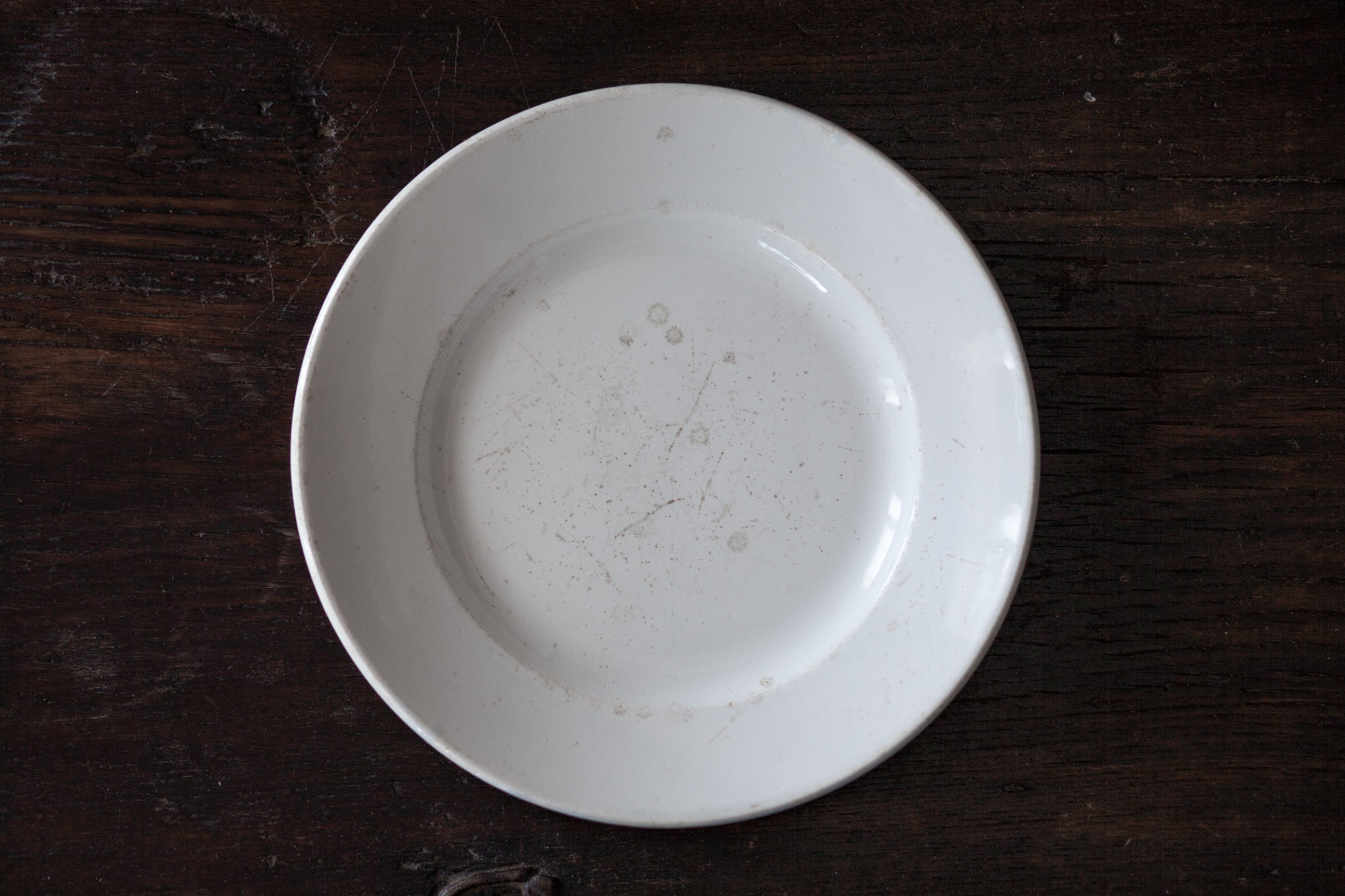 染み、カトラリー跡、釉の削げ。経年により使い込み生まれたアブストラクトな器景。柔らかな象牙の色合いに混じり合う古色のグラデーションは、使い込まれたファイアンスフィーヌ固有の美質です。1830年前後頃、モントロー窯。