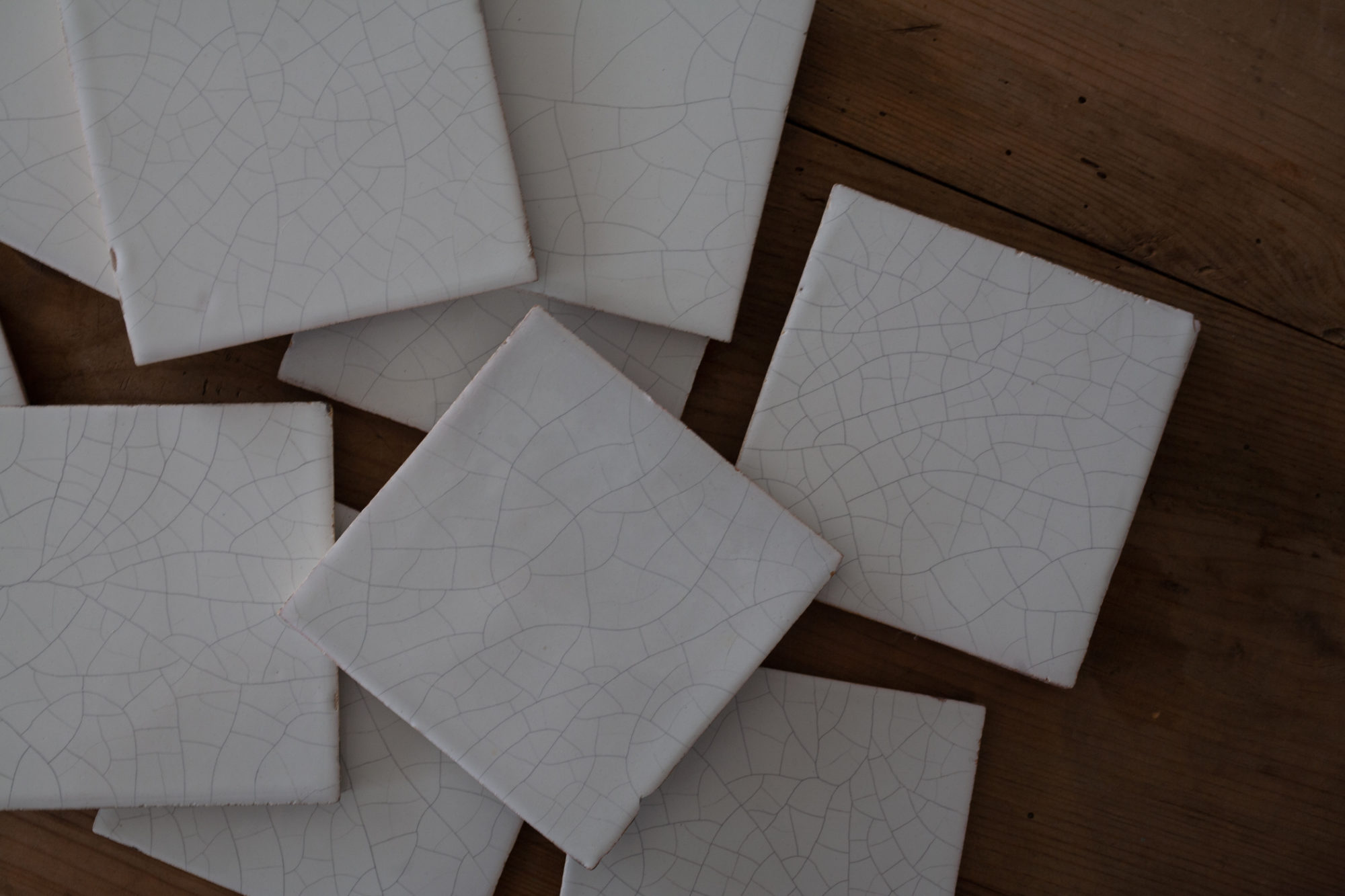 素朴なテラコッタ地に、ゆららかな白錫釉。素地と釉薬の膨張・収縮率が引き起こす自然な貫入は有機的で美しい。比して、きちりと切りそろえられた断面には、19世紀らしく、端正な市民社会の気配も漂わせており、その塩梅がちょうど良いなと感じます。19世紀フランス、ファイアンス陶のタイル。