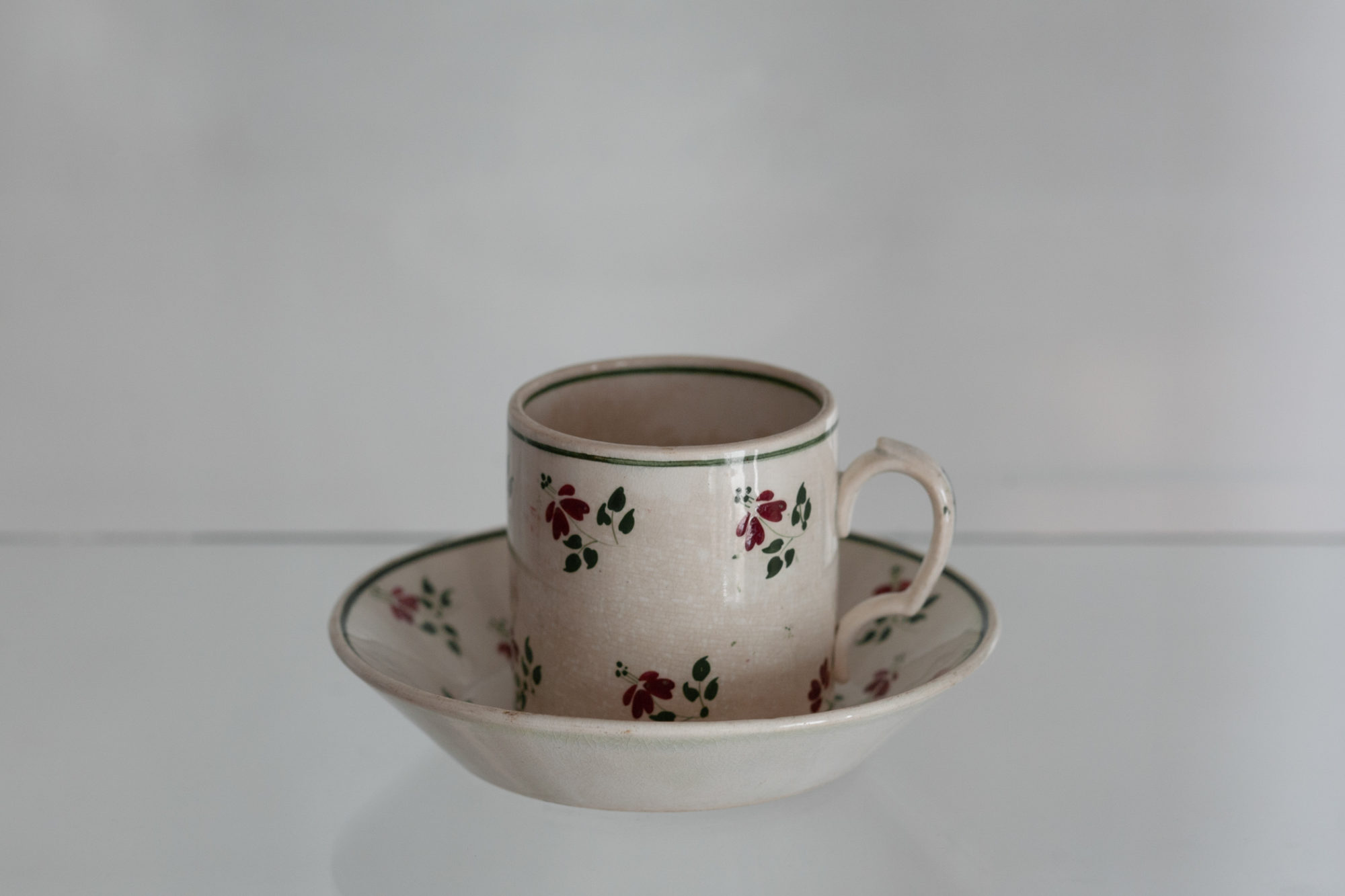 柔らかな牧歌。淀みなく流れるように描かれた細やかな図柄に、デコレーターが培ってきた確かな職人仕事の美しさを視ます。初期テールドフェールの不安定さも愛おしい、クレイユエモントロー、手彩小花柄のカップ&ソーサー。
