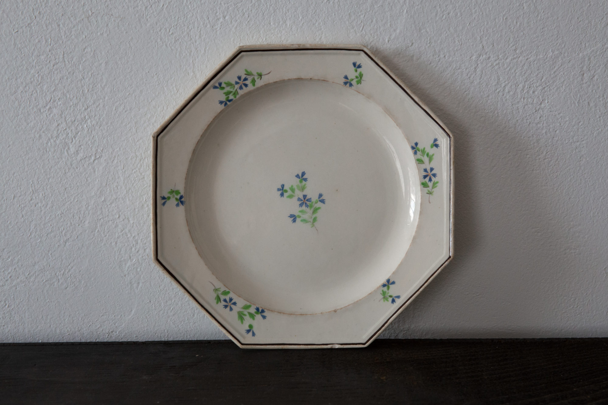 装飾性を排した端正なモデリングに散りばめられた細やかで薄い色彩。描きすぎない控えめな具合が好ましいです。1830年頃、フランス北部。矢車菊模様の色絵オクトゴナル皿。