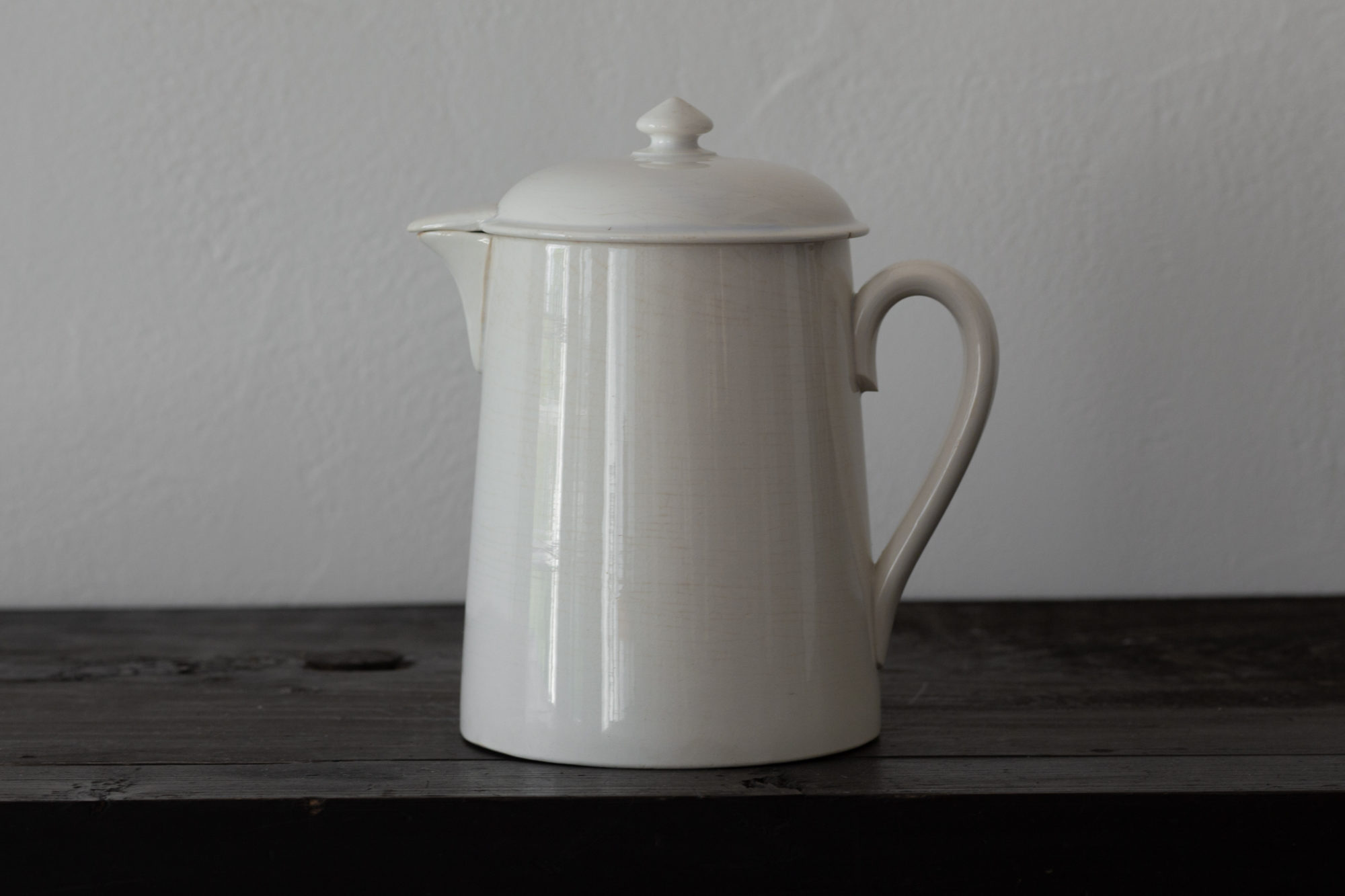 1920年代頃、ディゴワン・サルグミンヌより、白釉水差し。窯の定番品として作られていたもので、これ迄もその時々でさまざまなサイズを仕入れてきましたが、稀に見つかる蓋付きタイプの紹介です。