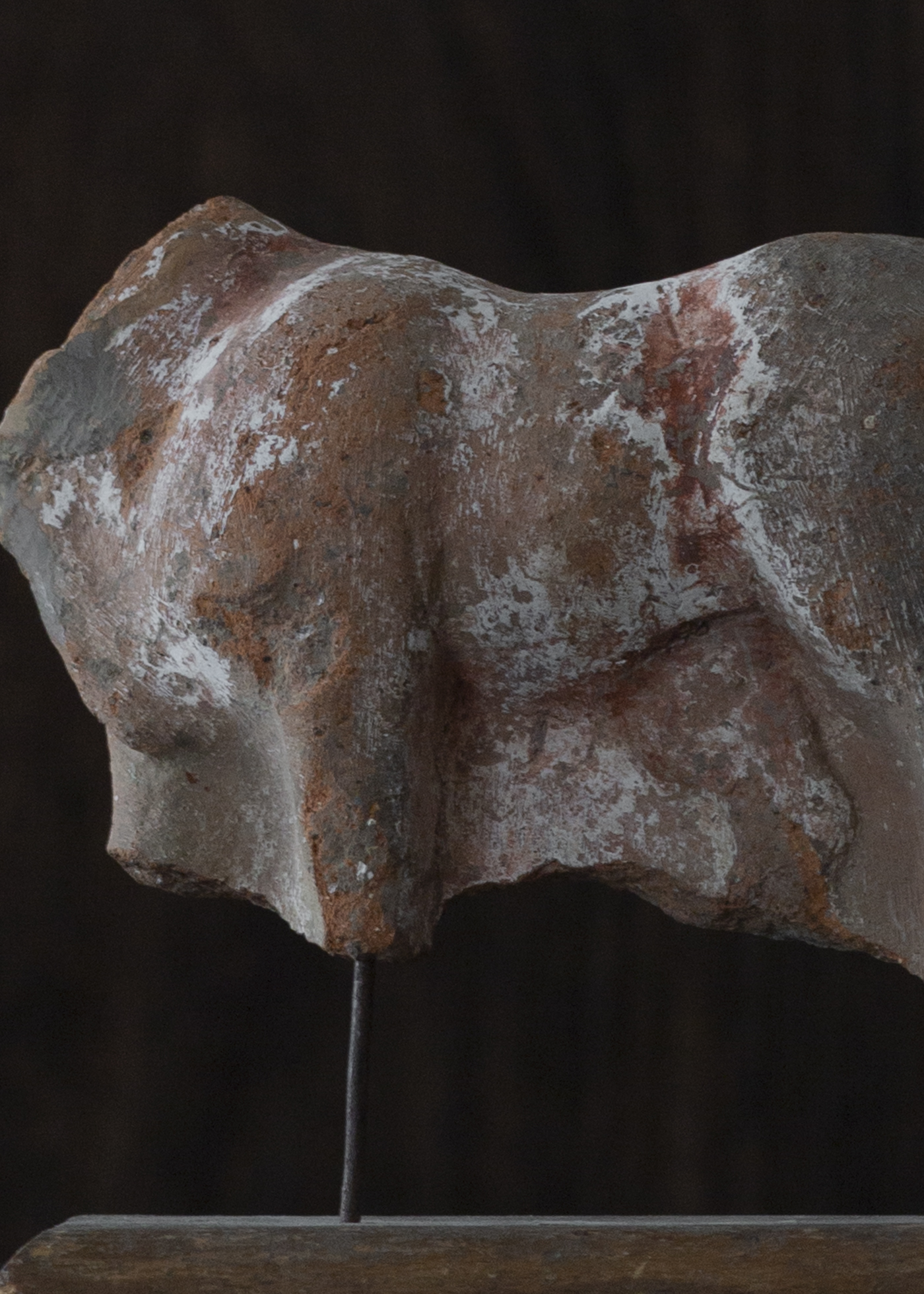 顔も足も欠損した像。発掘品が残欠なのは自然なことですが、例えばサモトラケのニケのような大作が美術館で体現してきた劇性とは異なる、小品こそが引き継ぐことのできた親密さを感じながら、かつての所有者の視線に想いを馳せます。