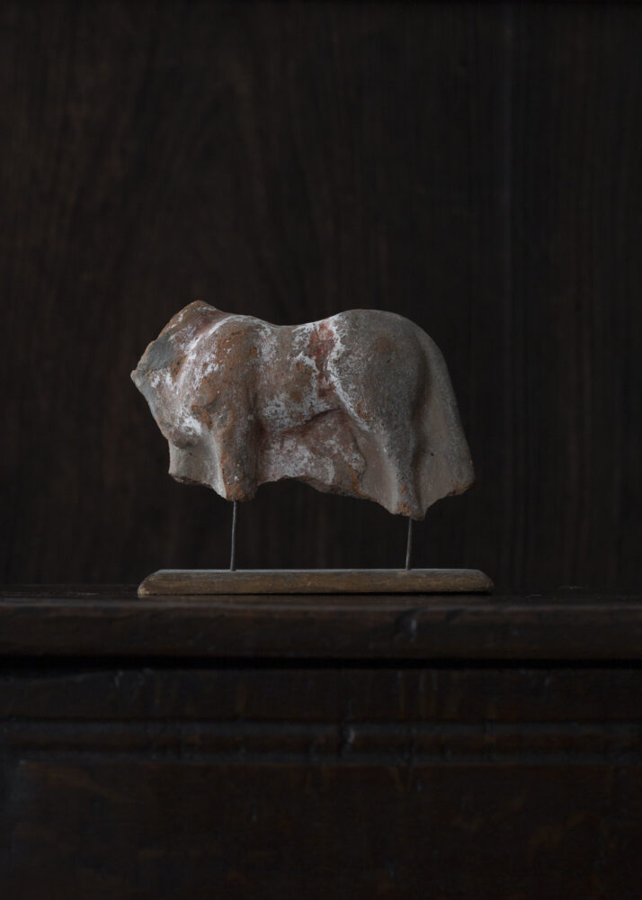 この種の雄牛の表現は、さまざまな素材で数多く作られており、重要な神殿や、家庭内の小さな礼拝空間などにしばしば奉納されたとされます。詳らかには判りませんが、玩具であった可能性もあるでしょう。