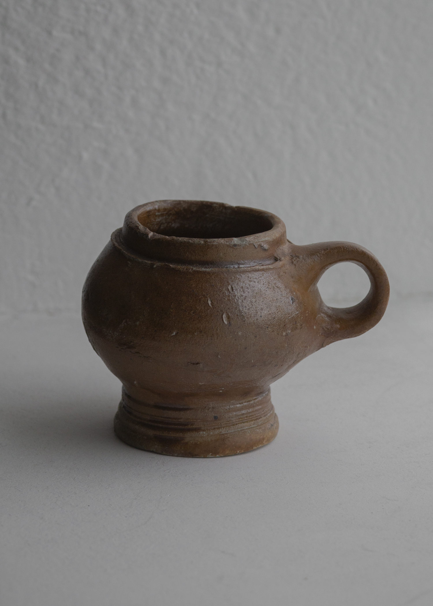 雑味を抑えながら愛らしさを感じる造形に惹かれました。小ぶりで丸胴、短い段付きの高台、シンプルな小環状の把手。恐らくはラーレン(現ベルギー最東部ドイツ語文化圏)、或いはフレッヒェン(現ドイツ、ケルン近郊)で焼かれただろうもので、控えめな光沢と柔らかで仄かにざらついた褐色の肌合いから、鉄分の化粧掛け後に薄い塩釉を施した当時の地域の慣習に即した作りと見てよいように思います。