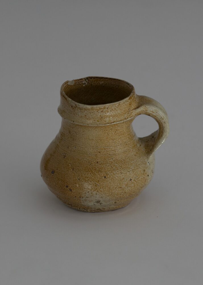 中世後期の香りがほのかに漂いながら、釉調や細部の仕上げには近世以降の発展の萌芽も前駆的に感じられ、過渡期のゆらぎを纏っています。既に顧客の階層分化が進んでいたライン炻器のなかでも、富裕層に向けられた上等品ではなく、当時大量に作られ、ピーテル・ブリューゲルが描いたような庶民が日常的に用いた雑器です。大らかさにこそ惹かれつつ、淡褐の色目は品があって、粗野な全体の印象を心地よく和らげています。